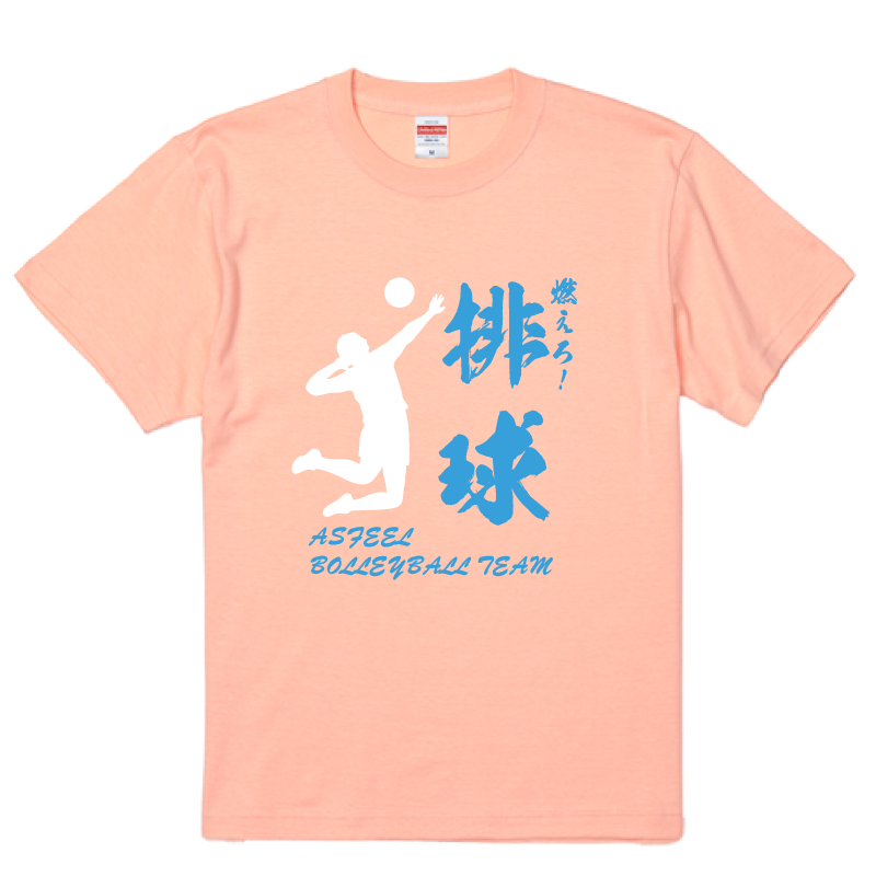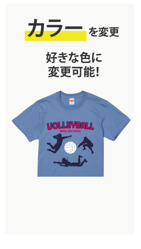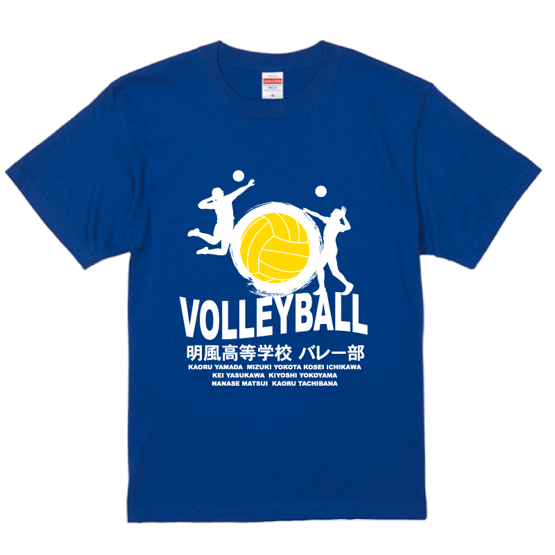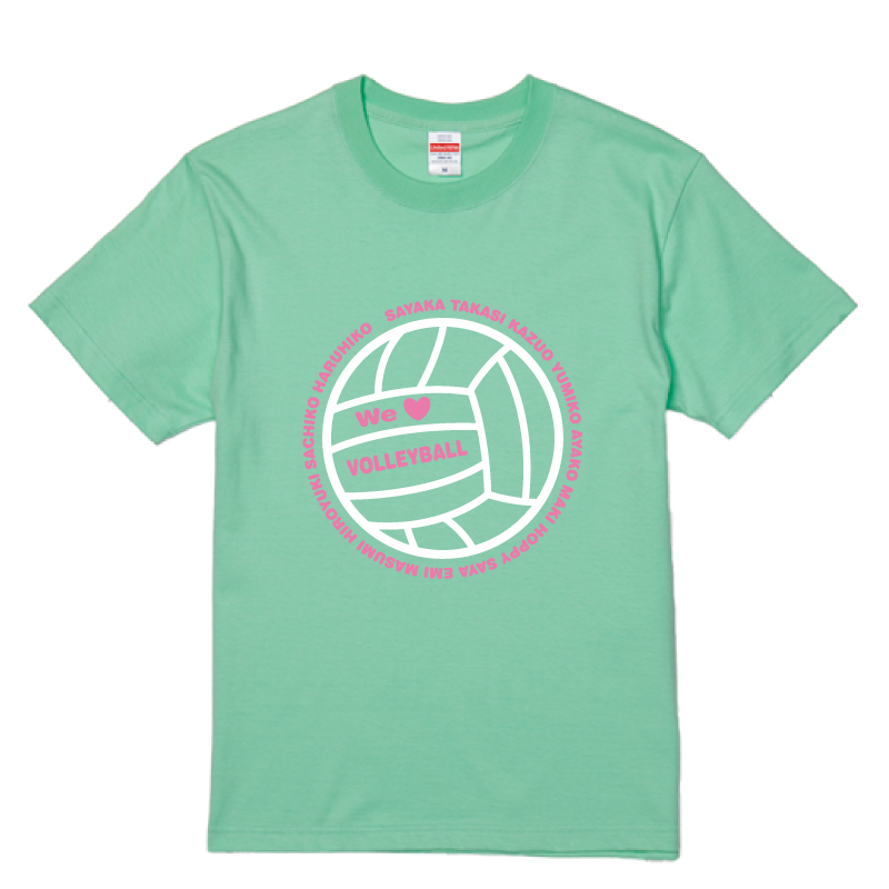バレーボールに沿ってチーム全員の名前を入れられるデザイン。お揃いのTシャツを着てチームの団結力を高めよう。 -