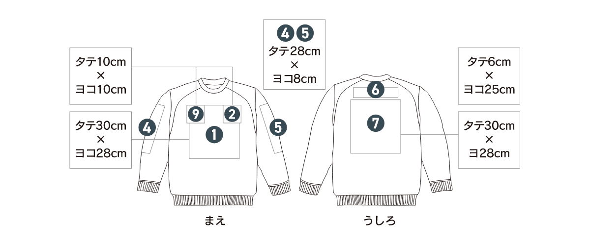 すべて統一のデザインでエンブレムや学校名、部活名などを印刷します。共通プリント専用書体、プリントカラーからご希望のものを選択してください。一つの印刷範囲内であれば、何色使っても料金は変わりません。