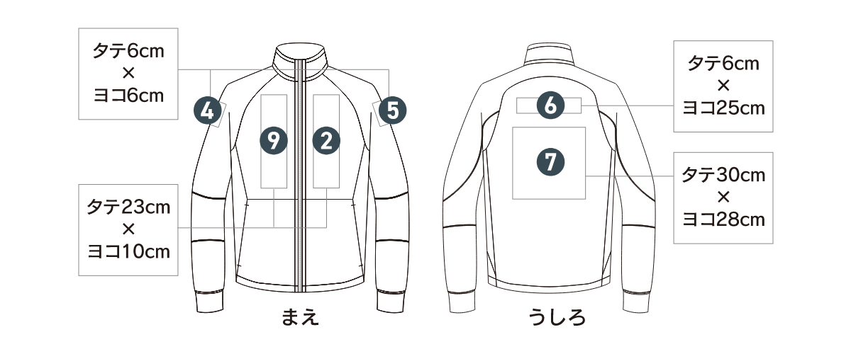 すべて統一のデザインでエンブレムや学校名、部活名などを印刷します。共通プリント専用書体、プリントカラーからご希望のものを選択してください。一つの印刷範囲内であれば、何色使っても料金は変わりません。
