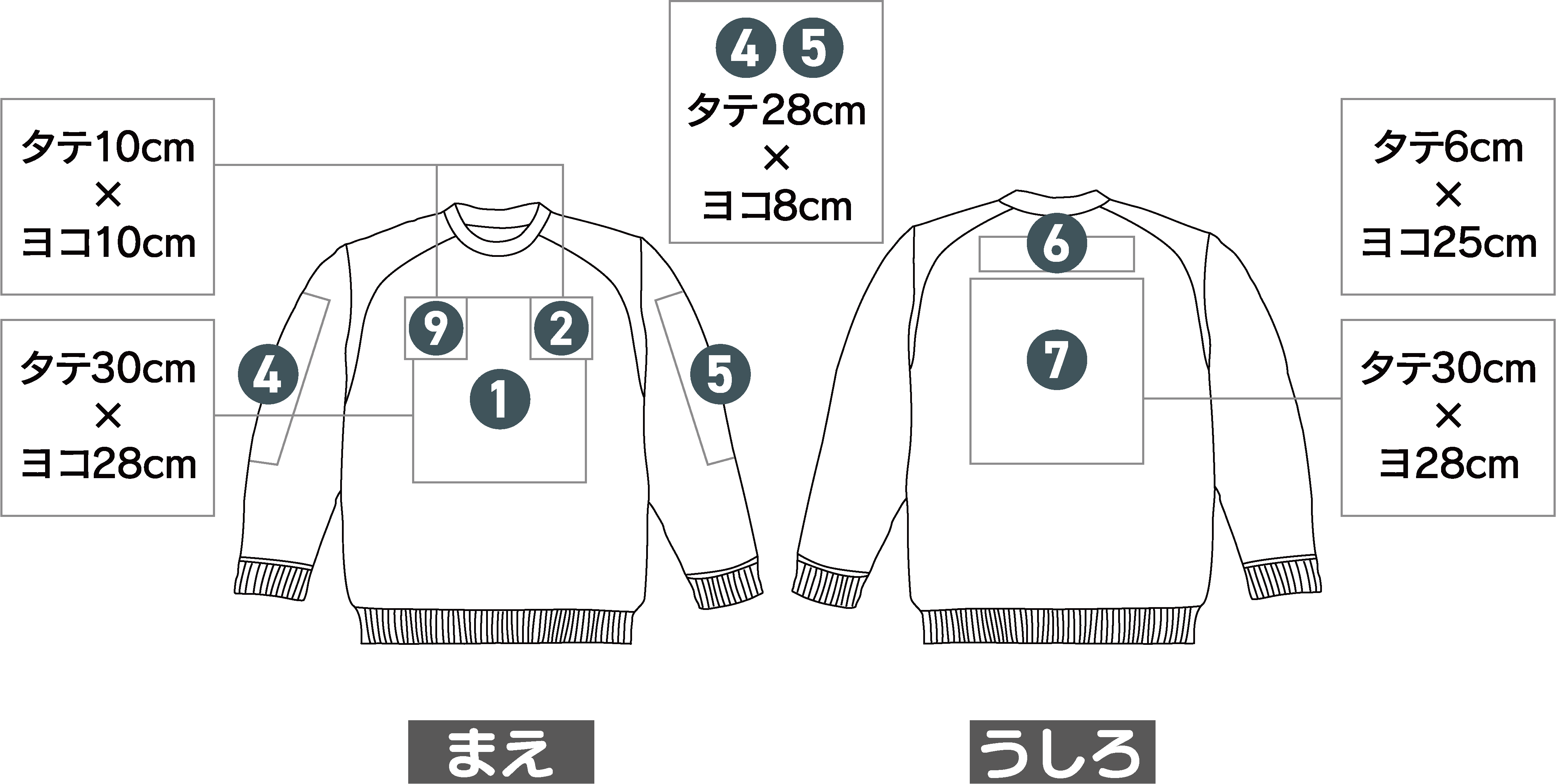 すべて統一のデザインでエンブレムや学校名、部活名などを印刷します。共通プリント専用書体、プリントカラーからご希望のものを選択してください。一つの印刷範囲内であれば、何色使っても料金は変わりません。