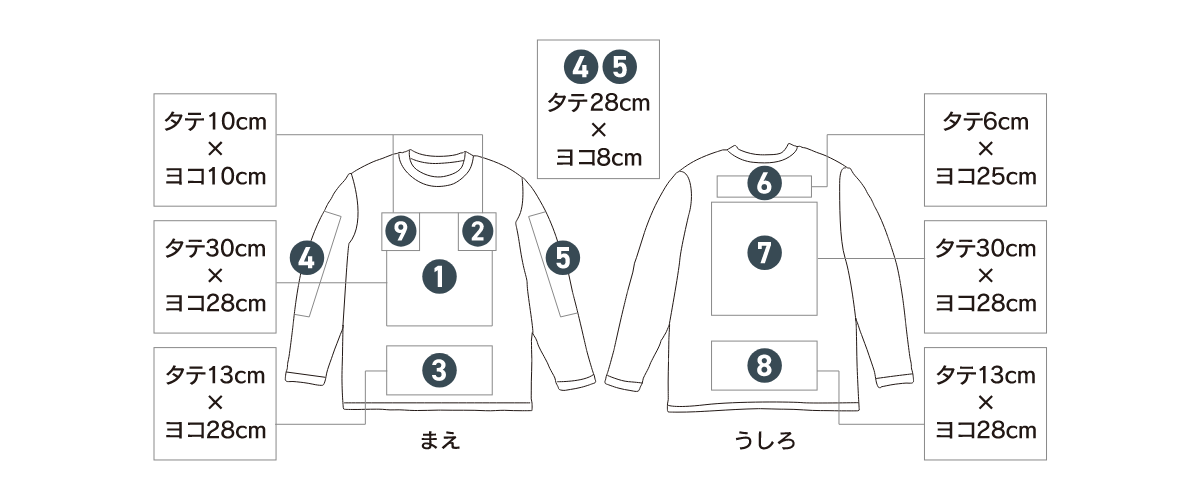 すべて統一のデザインでエンブレムや学校名、部活名などを印刷します。共通プリント専用書体、プリントカラーからご希望のものを選択してください。一つの印刷範囲内であれば、何色使っても料金は変わりません。