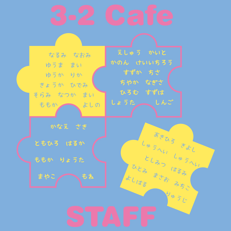 検索ワード:クラスTシャツ、クラT、行事、イベント、みんなの名前、個人名、あだ名、ニックネーム、球技大会、クラスマッチ、パズル、ピース、piece、カフェ、cafe、スタッフ、staff、実行委員会