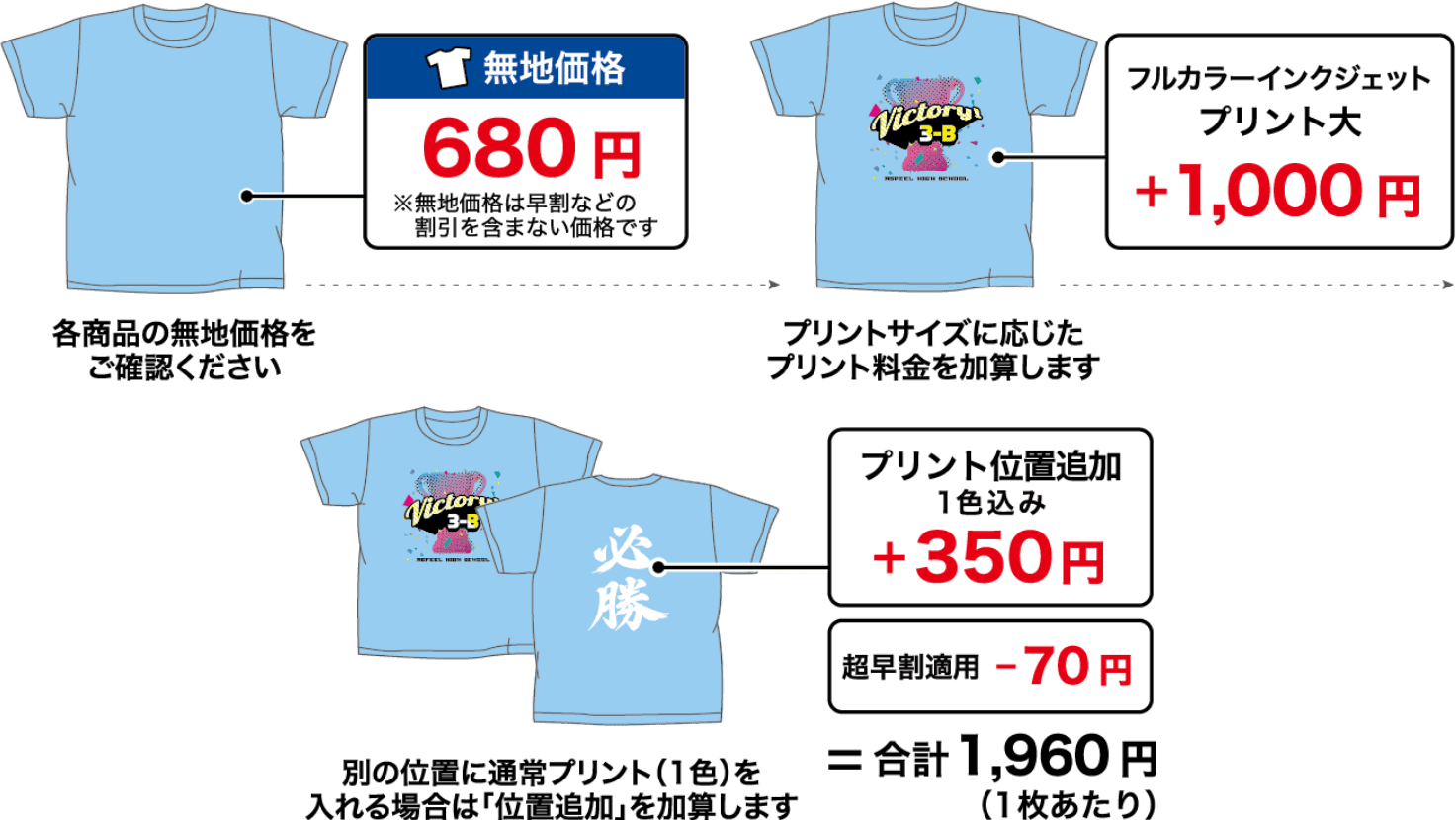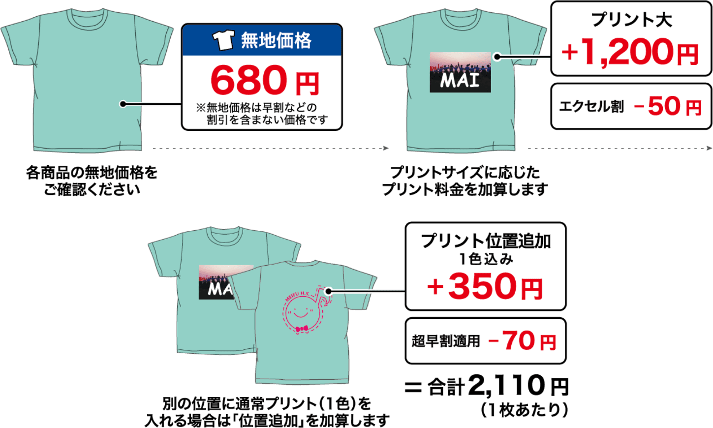 各商品ページの無地価格に下記金額を追加してください。